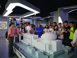 President Li Ning and students visited Ningde Nuclear Power EI Exhibition Hall to have a overall understanding on the principles of nuclear power generation and the development process of Ningde Nuclear Power, experienced VR, boarded the 88-meter viewing platform, overlooked the whole Ningde Nuclear Power Station, and took a photo in front of the EI Exhibition Hall. Then they visited the nuclear power simulator.