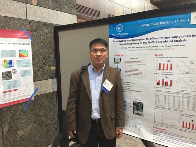 From Nov.1 to Nov.10, our professor Liu Yunquan attended “Biofuels and biobased productsthermal conversion seminar” (TCS2016), which washeld in Chapel Hill, North Carolina. The seminar was hosted by RTI International, an institution located in the Research Triangle, North Carolina. Nearly 200 researchers from over 20 countries attended the seminar. Professor Liu introduced a new method founded by his team to liquefy biomass, called “An innovative one-step method for efficiently liquefying biomass into bio-oil using Raney nickel and NaOH as combined catalysts”, and his paper arrested many peers’ attention. While attended the meeting, professor Liu not only discussed with scholars form the U.S. and other countries, but also learned the current research frontiers of biomass thermochemistry and catalytic conversion.