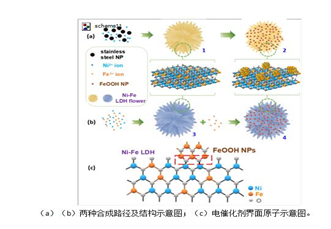 The research group synthesized FeOOH/LDH nanocomposites where numerous FeOOH NPs were stably anchored on the thin nanopetals of the hierarchically structured Ni-Fe LDH flowers via two methods. Particularly, the composite with average size of FeOOH/LDH NPs of 2.0 nm exhibited an overpotential of 174 mV at 10 mA·cm-2 and a tafel slope of 27 mV dec-1 in 1.0 M KOH. A mechanistic study based on XANES and EXAFS analysis, d.c. voltammetry and large amplitude Fourier Transformed a.c. voltammetry proved the presence of high-oxidation-state Fe(3+δ)+ sites with relatively short Fe(3+δ)+-O bond from the highly unsaturated ultrafine FeOOH NPs which could reform the local electronic structure and favorably manipulate the electronic oxidation and thus electrocatalytic behaviors of the Ni2+ species in the Ni-Fe LDH, hence leading to the easy formation, excellent OER activity, and extraordinary structural and catalytic stability. Their work puts an emphasis on the role of the solid-solid interfacial chemistry between a Ni-Fe LDH and a non-noble-metal component in engineering the local electronic structure of the active metal sites, which successfully pushed forward the catalytic activity of the well-studied Ni-Fe LDH far beyond its current limit in OER catalysis and opened up an avenue for rational design of OER electrocatalysts.