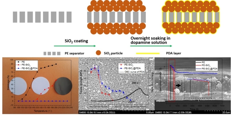 In this work, the team report a rational design of separator with substantially enhanced thermal features. The paper reports how, by a simple dip-coating process, polydopamine (PDA) formed an overall-covered self-supporting film, both on the ceramic layer and on the pristine polyolefin separator, which made the ceramic layer and polyolefin separator appear as a single aspect and furthermore, this layer amended the film-forming properties of the separator. Combining the function of the ceramic and PDA, the developed composite-modified separator displays substantially enhanced thermal and mechanical stability, with no visual thermal shrink and can maintain its mechanical strength up to 230 ℃ when the polyethylene separator acts as the pristine separator.