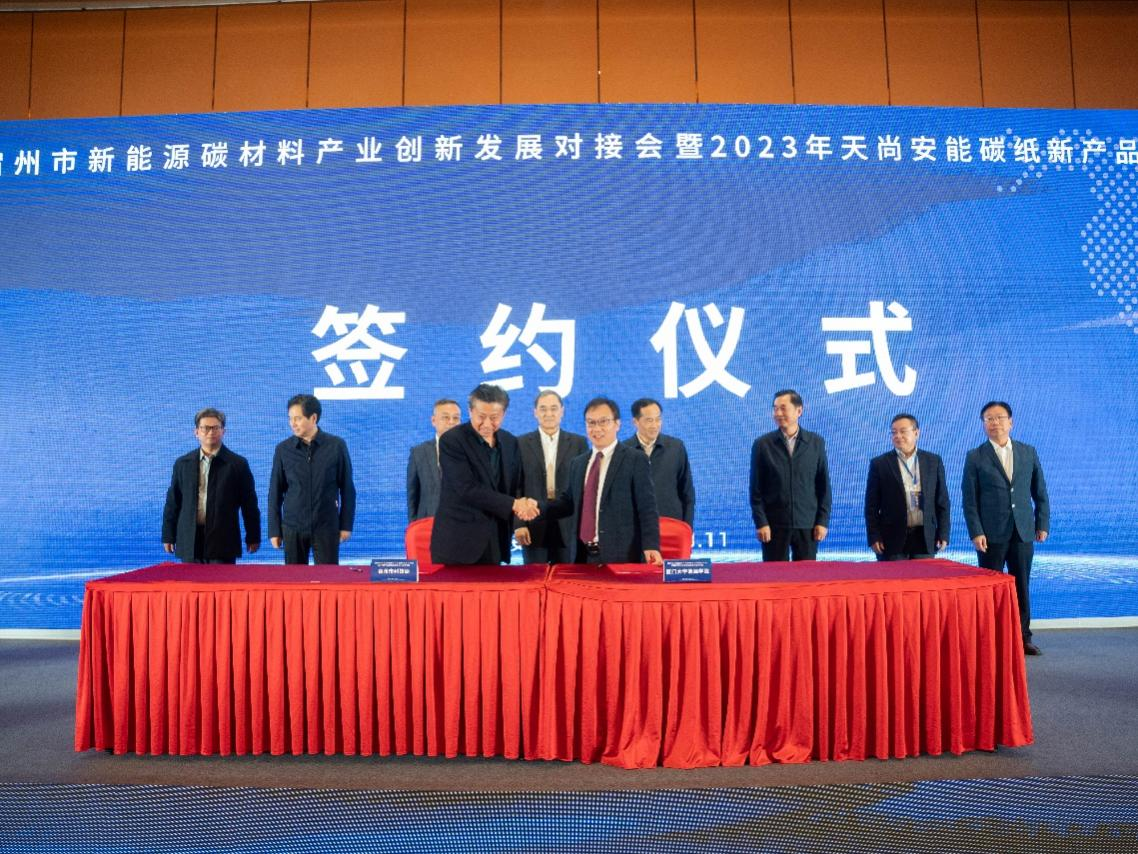 11月7日上午,宿州市新能源碳材料产业创新发展对接会暨2023年天尚碳纸新产品发布会在安徽省宿州市召开,会议发布了我校能源学院郑志锋教授团队研发的高性能碳纸新产品。中国工程院院士蒋剑春,宿州市委副书记、市长王启荣,厦门大学校长助理李智勇,能源学院党委书记王洁松、能源学院副院长(主持工作)郑志锋、国内合作办副主任吴喜平以及宿州市各直属单位、各县区和相关企业代表、厦门大学各单位代表共计220余人齐聚一堂,共谋宿州市新能源、新材料产业的高质量发展。开幕式上,王启荣市长、李智勇校长助理发表了热情洋溢的致辞,充分肯定了我校与宿州市的校地合作成效,为区域经济社会发展作出了贡献。