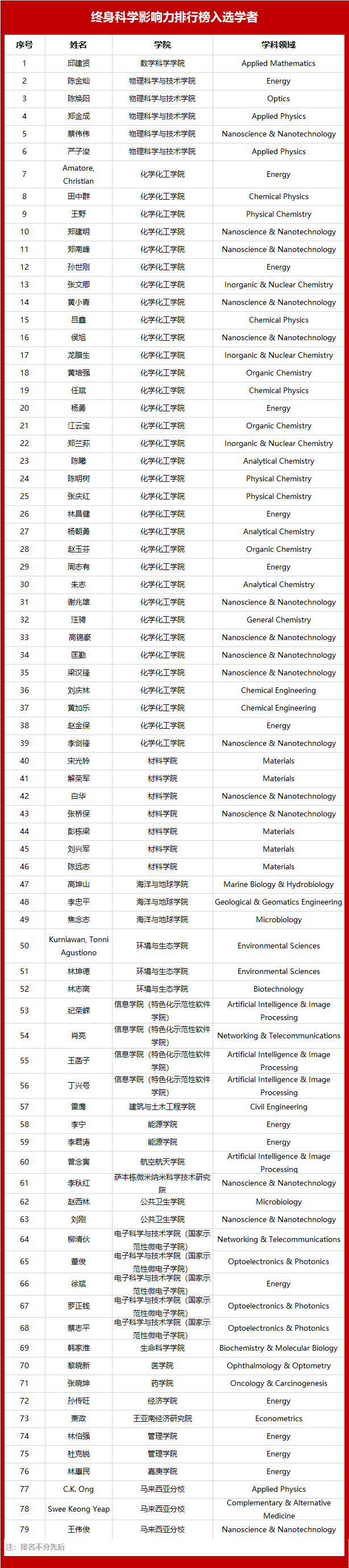 厦门大学能源学院李宁、李剑锋、景锐、曾宪海、赵英汝、唐兴、李君涛、杨述良八位学者入选全球前2%顶尖科学家“2023年度科学影响力排行榜”,其中李宁、李剑锋、李君涛三位学者同时入选“终身科学影响力排行榜”。