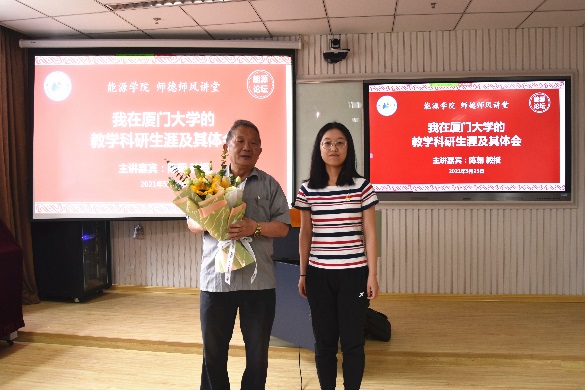 一个半小时的讲堂在全体师生热烈的掌声和《厦门大学学生战歌》嘹亮有力的歌声中结束了,学院党委副书记罗俊峰总结说:百年大计,教育为本;教育大计,教师为本。教师队伍的建设须把师德师风建设摆在首位。陈朝教授扎根厦大、热爱教学、关爱学生的从教经历就是最好的师德师风教育。今天的课堂也是一堂精彩的思政课,让在座的年轻师生受益匪浅。希望全院年轻教师以党和国家要求的“四有好老师”、“四个引路人”和“四个相统一”为标准,化鼓舞为行动,坚持以德立身、以德立学、以德施教。坚持以坚定理想信念,以高尚道德情操,以扎实专业学识,以宽厚仁爱之心为高等教育事业和学校的“双一流”建设贡献力量。
