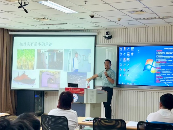 张尧立老师首先利用“雨课堂”小程序与师生们展开互动,从对“核”的态度,到对“核”的认识,一步步引导同学们辨证看待核技术,并通过生活中的“核”元素来激发同学们的学习兴趣。之后,张尧立老师对比了不同国家对发展核能的不同做法和态度,凸显了我国的制度优势。同时,张尧立老师从宏观和微观层面分析了核技术的利与弊,强调了自主技术和人才培养的重要性。