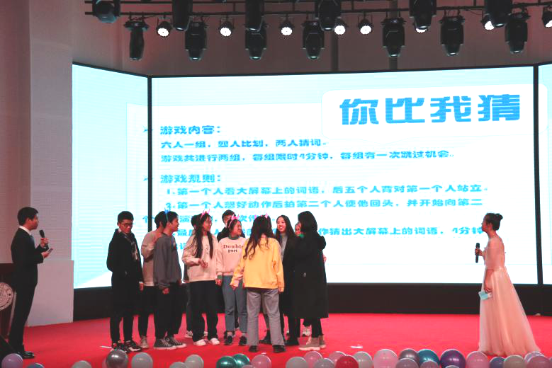 游戏环节“你比我猜”,同学们踊跃上台参与其中,他们的动作表演生动有趣,现场阵阵笑声,气氛轻松愉悦。