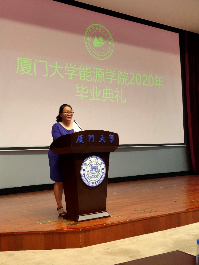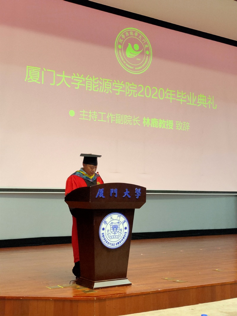 毕业典礼在国歌声中正式拉开帷幕。学院主持工作林鹿教授首先热烈祝贺2020届全体同学顺利毕业,向帮助毕业生成长的师长、家人和朋友表示感谢。他在致辞中表示,今年毕业季非常不平凡,站在历史的交汇点上,一个个特殊的“时间坐标”叠加,注定将让2020年载入史册。厦大师生打了一场疫情防控阻击战和平安校园保卫战,学院师生攻坚克难,捷报频传。他强调,今年毕业生中有很多学院的第一届本科生,正因为我们选择了彼此,同舟共济,才有了今天年轻而有活力,青春不失风采的能源学院。他希望大家胸怀天下,心系家国;仰望星空,脚踏实地;立志成才,不负韶华。最后,他欢迎大家相聚厦大百年,毕业生们前程似锦,大有作为。