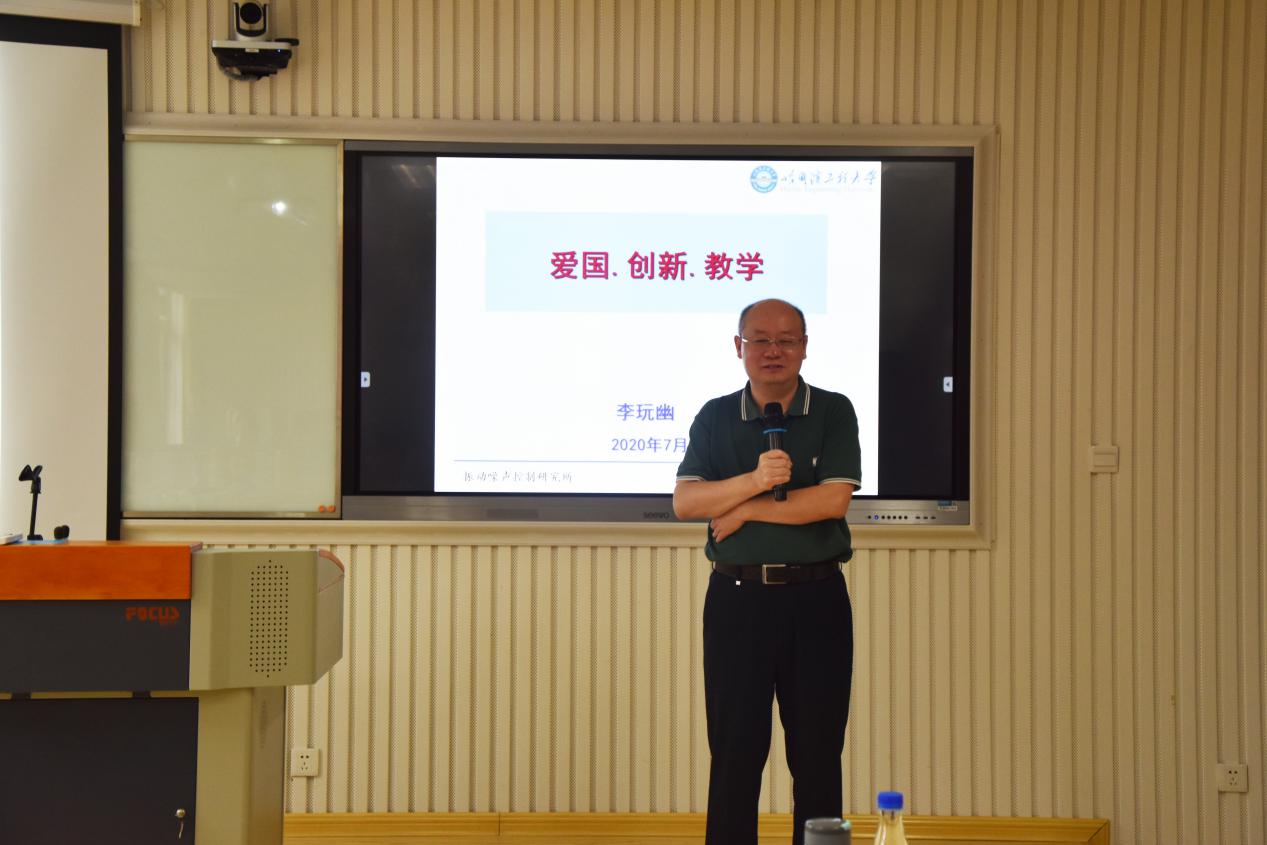 李玩幽教授以爱国.创新.教学为题开讲,谈到如何把爱国主义教育融入教育教学全过程,积极践行科教报国时代担当时,他说,只有把研究方向当成事业来奋斗,才能在工程、技术、科学三个层面贯通,李教授紧盯国家战略需求,在接地气的工作中谋求创新,将自己的热爱与热血投入为国家解决难题的实际工作中。李教授身体力行,将踏实工作理念传导给学生,他常年带着学生深入一线,撸起袖子、俯下身子,在船舱中解决企业、国家的实际问题、难题。他不仅亲身示范了什么叫“干事、干大事、为国担当”,也将团队凝聚成一个温暖的家、一个能做事的家。