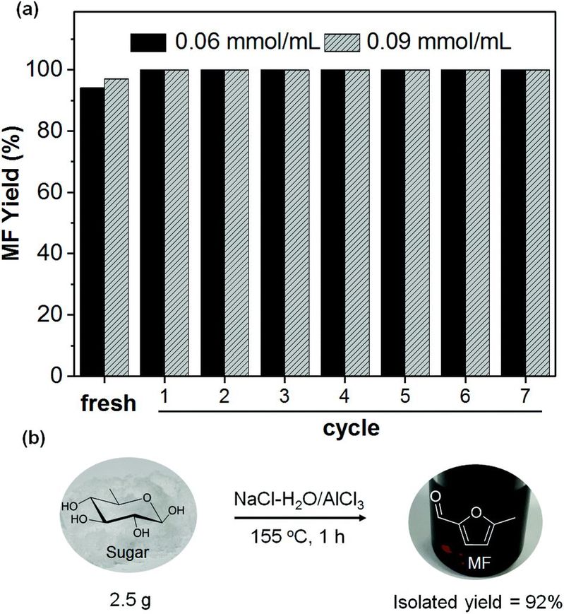 Fig. 5 (a) Catalytic behaviour of the NaCl-H2O/AlCl3 system for the conversion of L-rhamnose to MF over 7 consecutive cycles and
