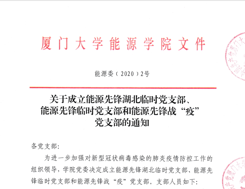 疫情暴发以来,院党委积极动员师生党员投入到这场没有硝烟的战争中,用行动对照初心,用担当书写使命。能源先锋湖北临时党支部组织身处湖北疫区的7名学生党员争先锋、做表率,投身战“疫”一线。2016级博士生党员李蒙把黄冈市长春村作为自己的党员责任区,从厦门购买的400个口罩中拿出300个送给当地村民,号召村民不串门拜年,带头实施封村封路;2018级本科生预备党员王圣友主动请缨,成为恩施州下坪村村委“尖刀班”成员,起草《致下坪村乡亲们的一封信》,挨家挨户宣传科学防疫知识;2019级博士生党员吕超,成为村委防护志愿者,日夜坚守在村子路口监测进出人员体温,为家乡人民生命安全保驾护航。生物能源与化学能源教工党支部王夺和龚正良等教师主动为身处重点疫情区的学生寄送防护口罩,疫情面前再添温暖。