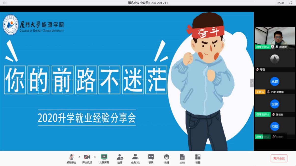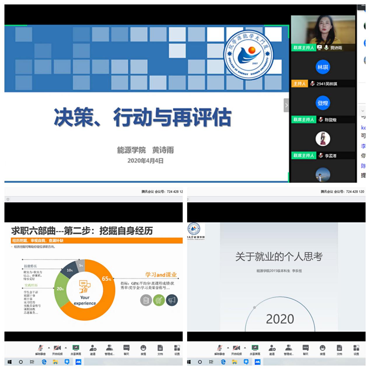 今年的春天是特别的,疫情或许阻挡了我们返校的脚步,但挡不住经验的分享与感悟的交流。为帮助同学们在疫情期间做好升学、就业的准备,我院于4月3日及4日晚成功举办了“能源学院2020年升学就业经验分享交流会”, 2015级本科生李乐恒、2016级本科生熊贝妮、田扣扣、陈燕地、谢世俊、何逸盈、2017级研究生李孟渚和国家职业指导师黄诗雨老师出席了本次分享会并为同学们做了经验分享。8位嘉宾通过精心准备分享、有的放矢地介绍升学与就业路上地经验感悟,不仅为同学们带来了干货十足的分享,还一一解答了同学们的疑问。分享会结束后,同学们均表示收获满满、受益匪浅。