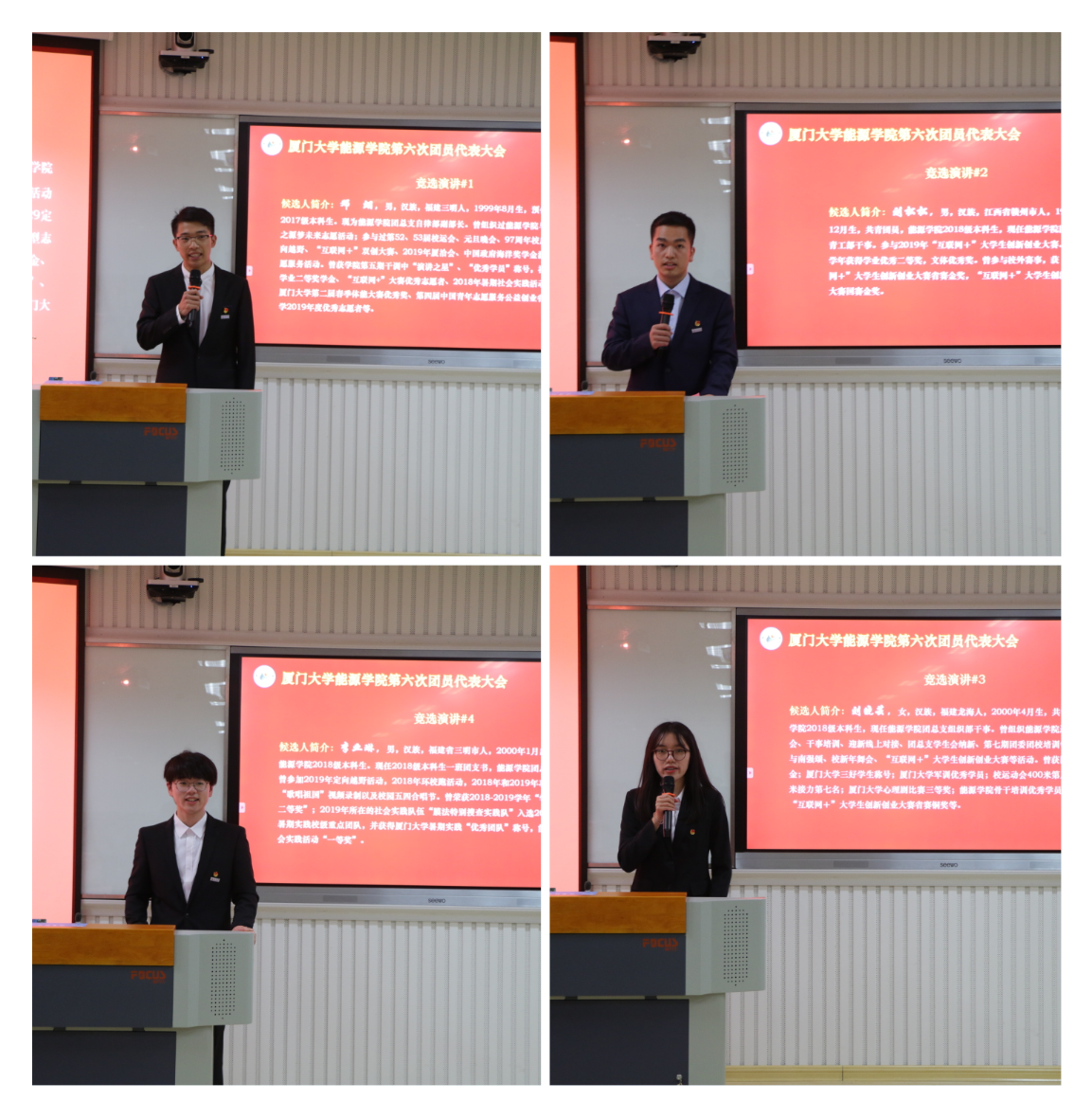 随后,能源学院第六届团总支委员候选人分别上台竞选。2017级本科生邓翊、2018级本科生刘松松、2018级本科生李业琳、2018级本科生刘晓芸、2018级本科生吴林琪、2017级本科生梁钰莉,分别上台作竞选演讲,他们都表达了自己对学生工作以及对部门温暖的大家庭的热爱,回忆了自己在过去几年内在学生工作过程中学到的知识与技能,明确自己将不忘初心、尽职尽责的做好未来的学生工作。