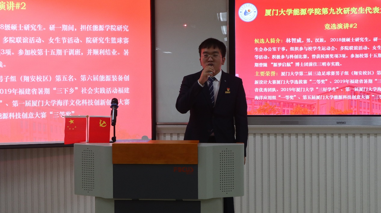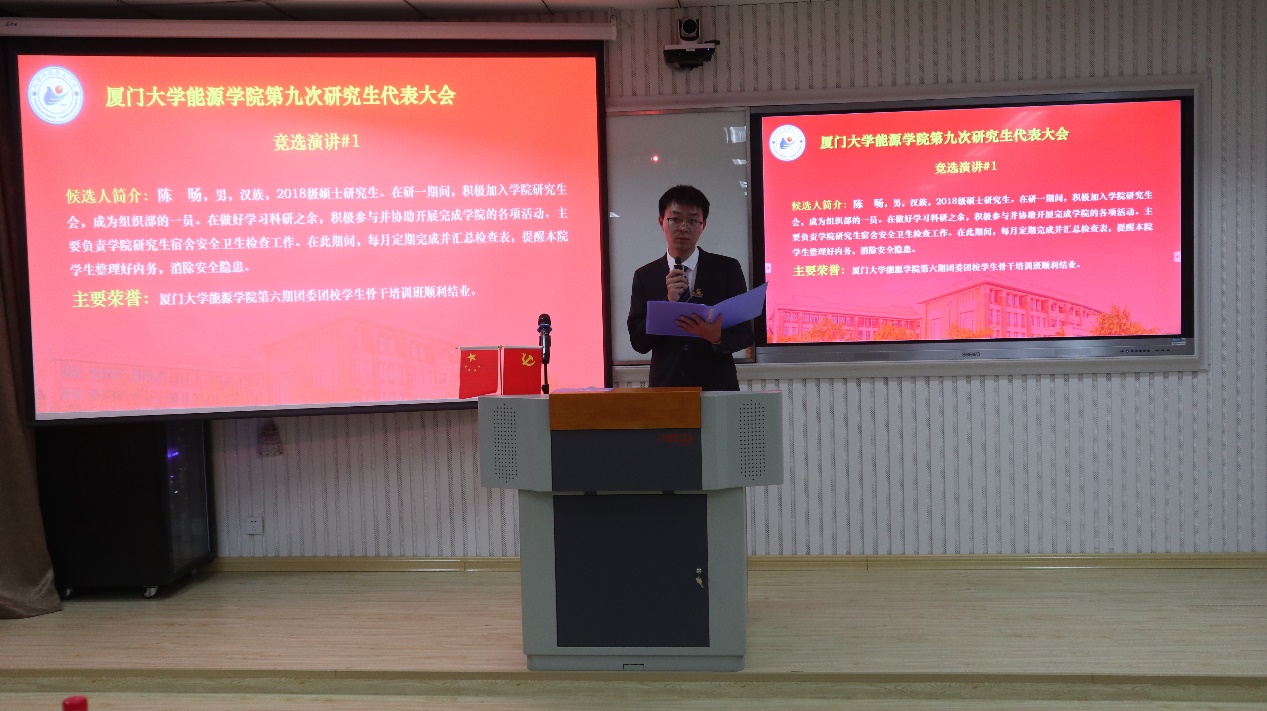 12月30日19:30,能源学院第九次研究生代表大会、第九次研究生团员代表大会在和木楼A221隆重召开。学院党委副书记马兆海老师、团委书记龚树丰老师、辅导员黄诗雨老师,校研究生会与翔安校区各学院研究生会代表出席会议。会议由我院第八届研究生会副主席李孟渚主持,回顾了学院第八届研究生会和团总支所做的工作,选举产生了能源学院第九届研究生会主席团、研究生团总支委员。
