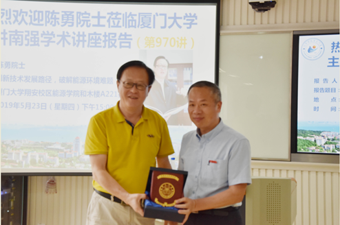 5月23日下午,中国工程院院士、中科院广州能源研究所陈勇研究员应能源学院邀请,做客厦门大学第970期南强学术讲座,在能源学院和木楼A221报告厅做题为《创新技术发展路径,破解能源环境难题》的精彩学术报告。讲座由能源学院党委书记孙梓光主持,校长助理张建霖教授为陈勇院士颁发了南强学术讲座纪念牌。