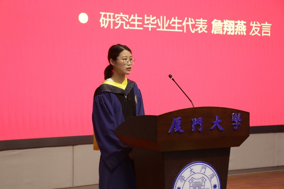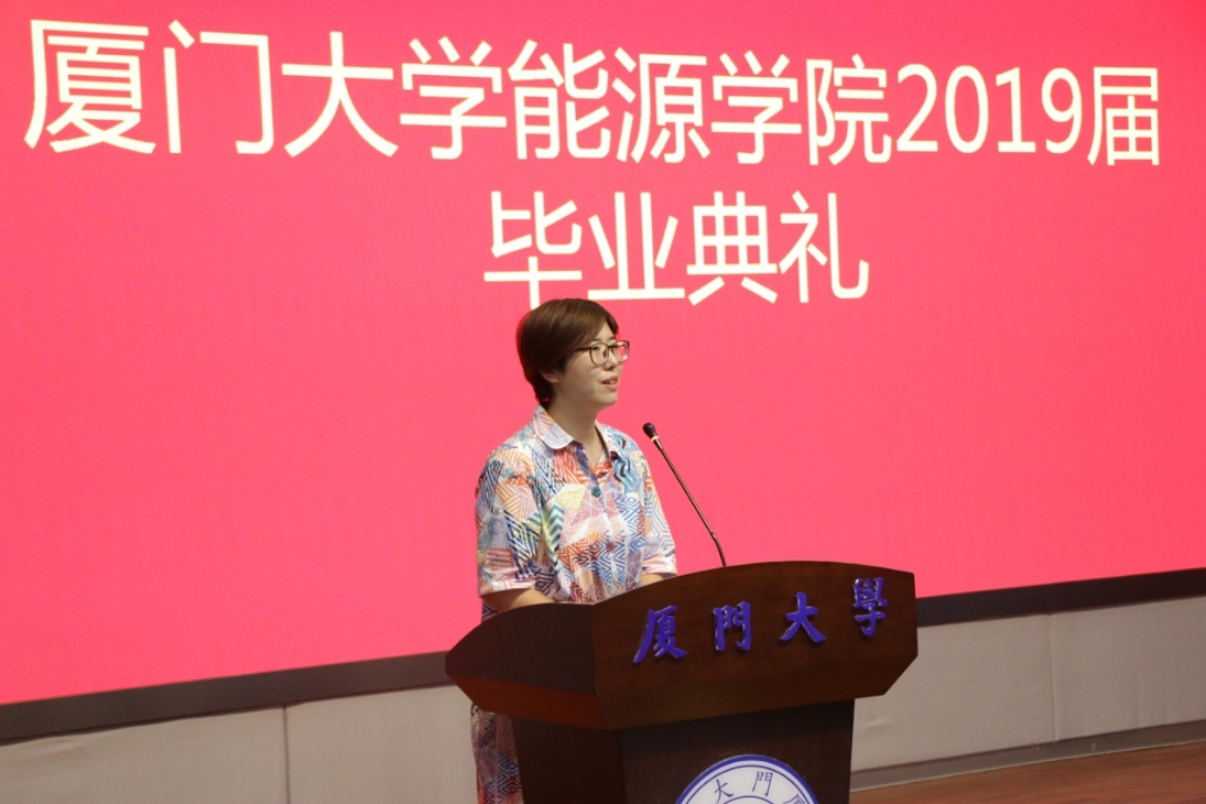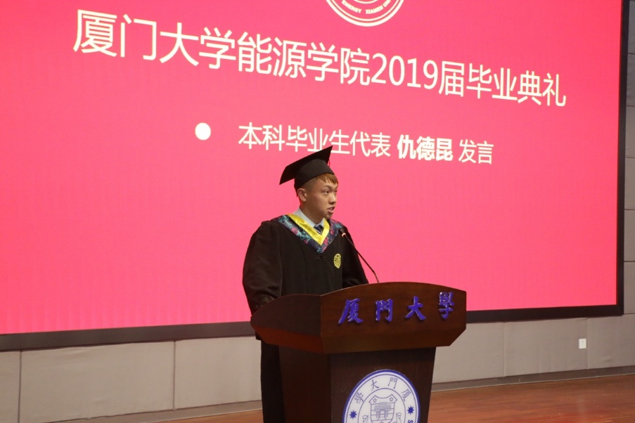 本科生毕业生代表仇德昆、研究生毕业生代表詹翔燕接着分享了毕业感想。仇德昆从感恩一切、勇敢担当和默默奉献三个方面讲述了自己作为“能源人”的成长故事,表达了自己与同学们将牢记“发展能源技术,共同改变世界”的学院目的,为真理、为国家、为世界贡献力量。詹翔燕分享了自己三年间感恩师友、学会理解与包容和感受希望与快乐的收获,希望能在自己未来的职业生涯中通过努力获得不断前行的希望与力量。