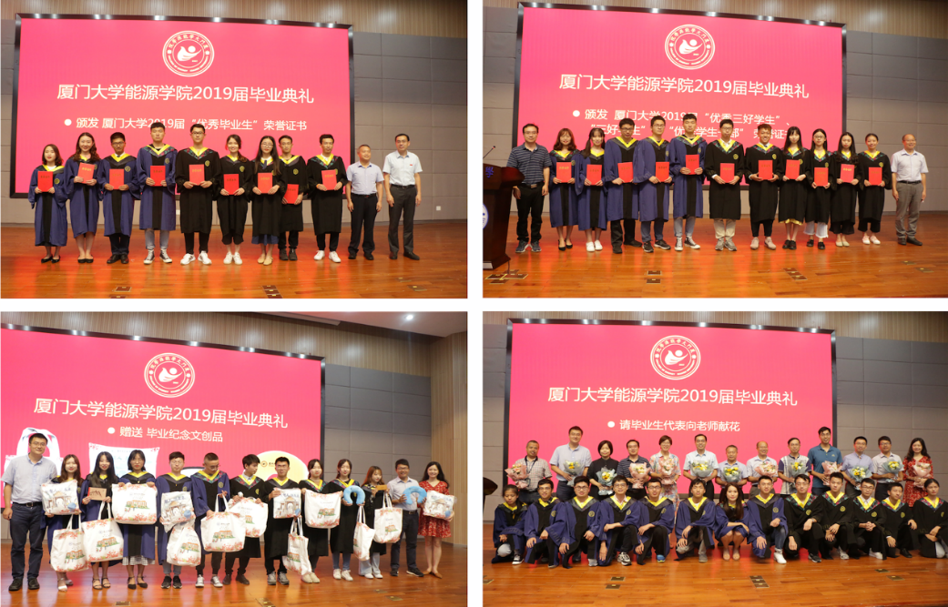 随后,副院长林鹿教授宣读了能源学院2019届本硕博毕业生名单和荣获厦门大学“优秀三好学生”、“优秀毕业生”、“优秀学生干部”、“三好学生”的名单,并与孙梓光书记一同为“优秀毕业生”颁发获奖证书。马兆海副书记和郑志锋教授一起为“优秀三好学生”、 “三好学生”、“优秀学生干部”颁发荣誉证书。紧接着,2015级本科班主任张鹏、团委书记龚树丰和辅导员黄诗雨向毕业生代表赠送了饱含能源特色和美好祝愿的毕业纪念文创,毕业生代表们也通过敬献花束来答谢师恩。全体师生接着观看了本科生毕业视频,回顾了一同奋斗过的四年岁月,“青春不散场”。