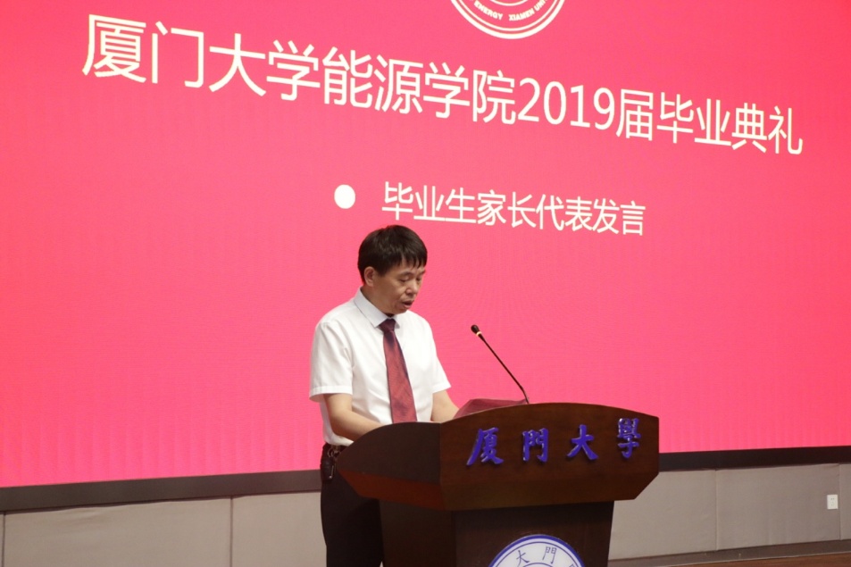 紧接着,2015级本科生黄纯颖的父亲作为家长代表发言。他先向圆满完成学业的同学们送上热烈祝贺,并对辛勤付出、日夜操劳、精心育才的学院领导、老师们表示衷心感谢。随后,他希望同学们能够以新时代青年的身份自勉,敢闯敢拼,创造奇迹;永葆善心,积善成德;感恩亲朋,回馈母校。