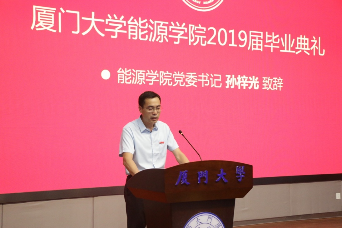 6月19日下午,能源学院2019届毕业生典礼在德旺图书馆小报告厅隆重举行。学院党委书记孙梓光,副院长林鹿教授,党委副书记马兆海、孙佳,郑志锋教授、赵英汝教授、郑淞生副教授、2015级本科生班主任张鹏副教授、黄子敬老师、李水荣老师、办公室主任张正泓、团委书记龚树丰、辅导员黄诗雨与2019届全体本硕博毕业生、部分学生家长和低年级学生代表共聚一堂,一同见证毕业生们扬帆远航的美好时刻。毕业典礼由党委副书记孙佳主持。