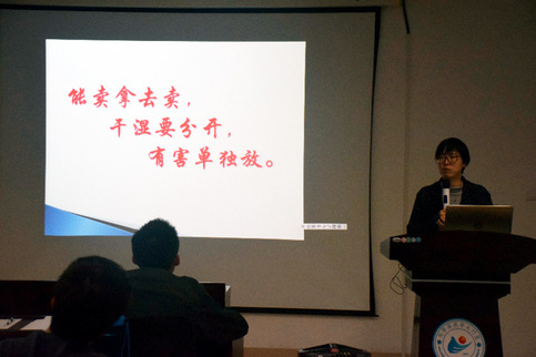 南强物业翔安校区物业部向峰向大家讲解了生活垃圾的分类常识。他提到,垃圾分类我们要从源头上做好,否则整个垃圾分类链条都不能成功。他就生活垃圾的分类标准、垃圾分类桶的识别进行了讲解,积极宣传垃圾分类知识,倡导分类的十五字理念——能卖拿去卖,干湿要分开,有害单独放。