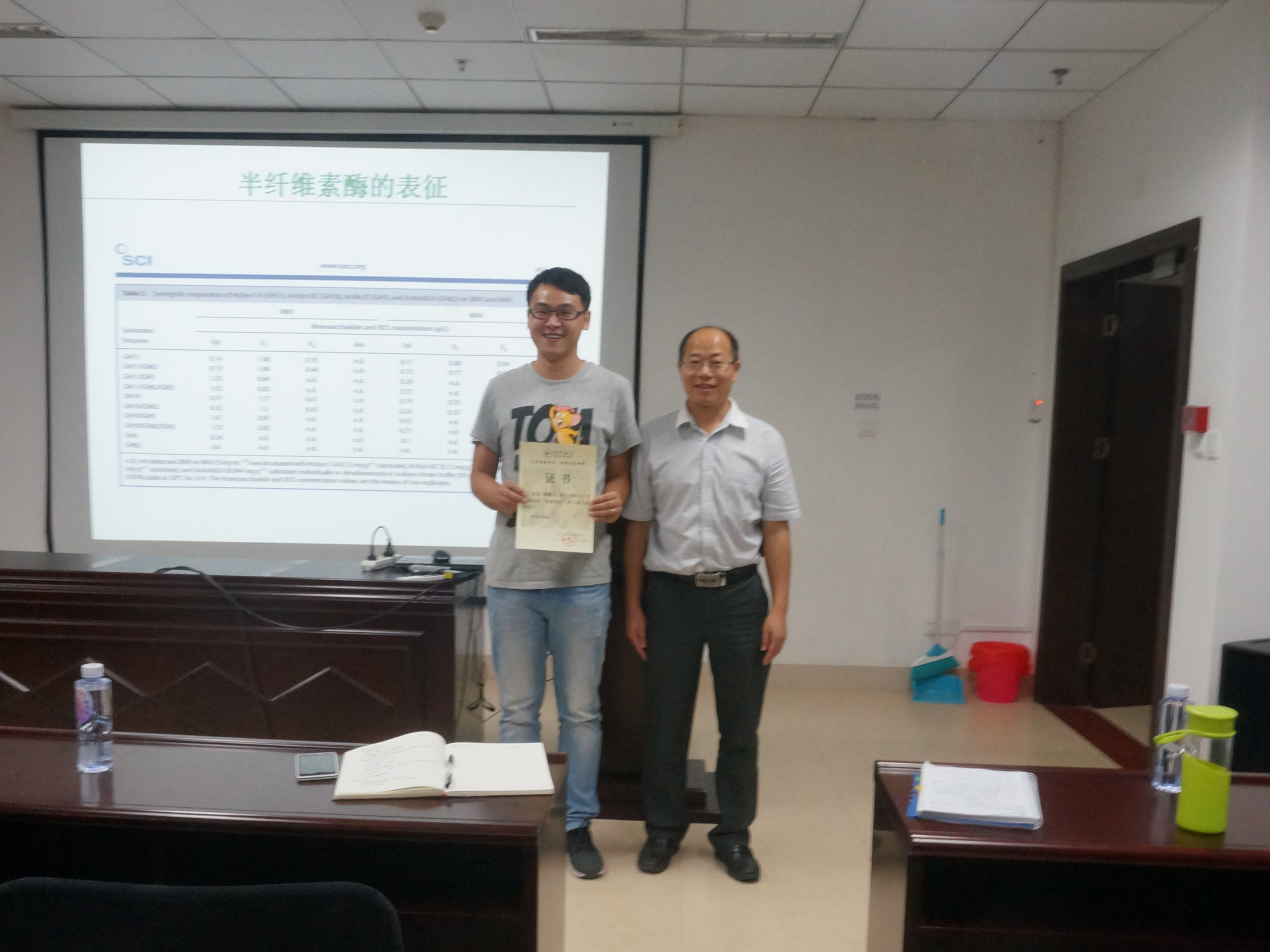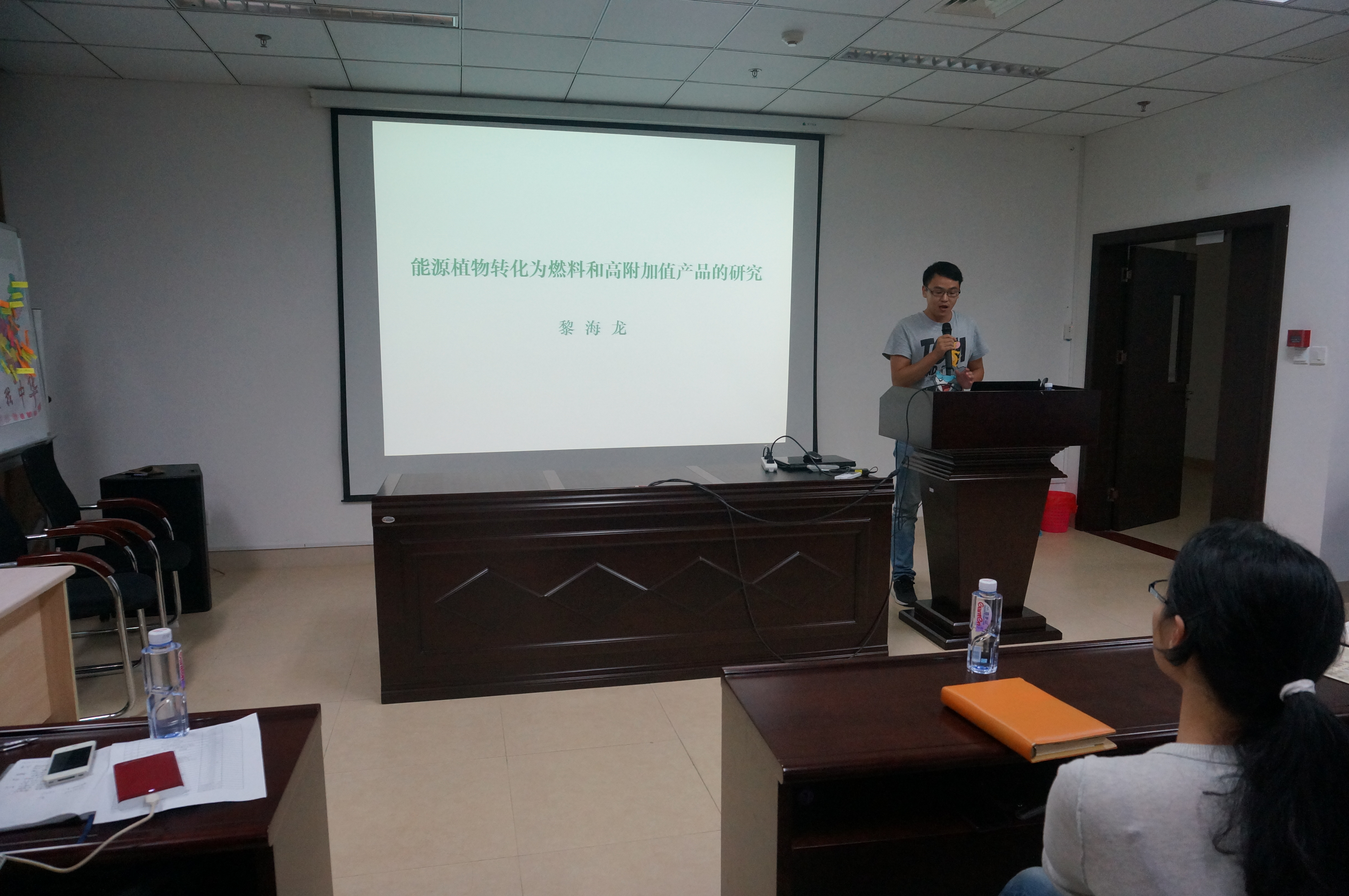 在会上,黎海龙同学主要讲述了对能源植物转化为燃料和高附加值产品的研究。他从最基本的实验原理讲起,言简意赅。接着,又说到该项技术的应用,涉及燃料乙醇国内外的发展现状和纤维素乙醇的瓶颈与突破口等等。看似复杂枯燥的科学实验在黎海龙学长风趣幽默的讲解下变得十分奥妙,吸引力倍增,现场气氛也活跃了起来。最后,黎海龙同学结合自己的研究课题与同学们讲述了他的科研经历,为同学们的择业和深造提供了许多宝贵的建议。