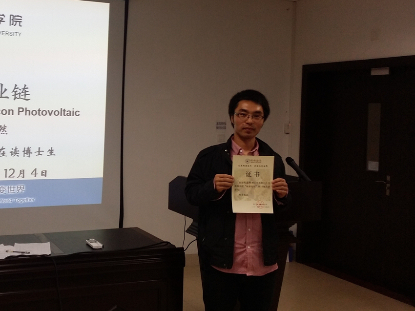 12月4日晚7:30,第十五期能源论坛在能源学院和木楼A221成功开讲。能源学院光伏方向在读博士生程浩然同学受学院邀请为大家带来了一场题为《硅光伏产业链》的精彩讲座。2013级、2014级本科生和部分研究生听取了本次讲座。