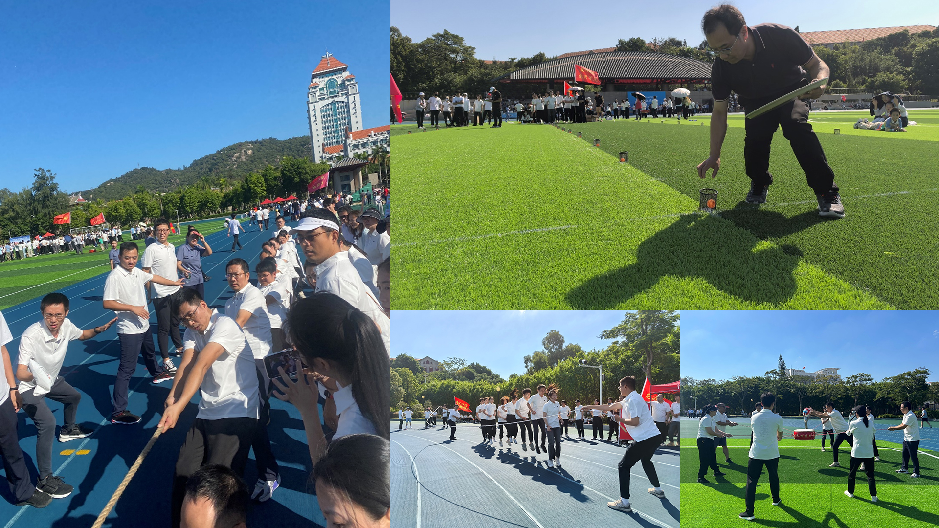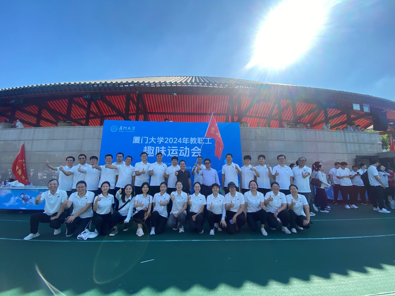 11月17日,2024年厦门大学教职工八段锦和健身操集体展演和趣味运动会在演武操场举办。八段锦和健身操展演后,首先进行的是人气最高的拔河赛,在阵阵呐喊助威声中,学院拔河队先后战胜继续教育学院队、资产公司队和机关队,以小组第一出线,接着又一鼓作气力克出版社队,按规则获得拔河赛并列冠军。