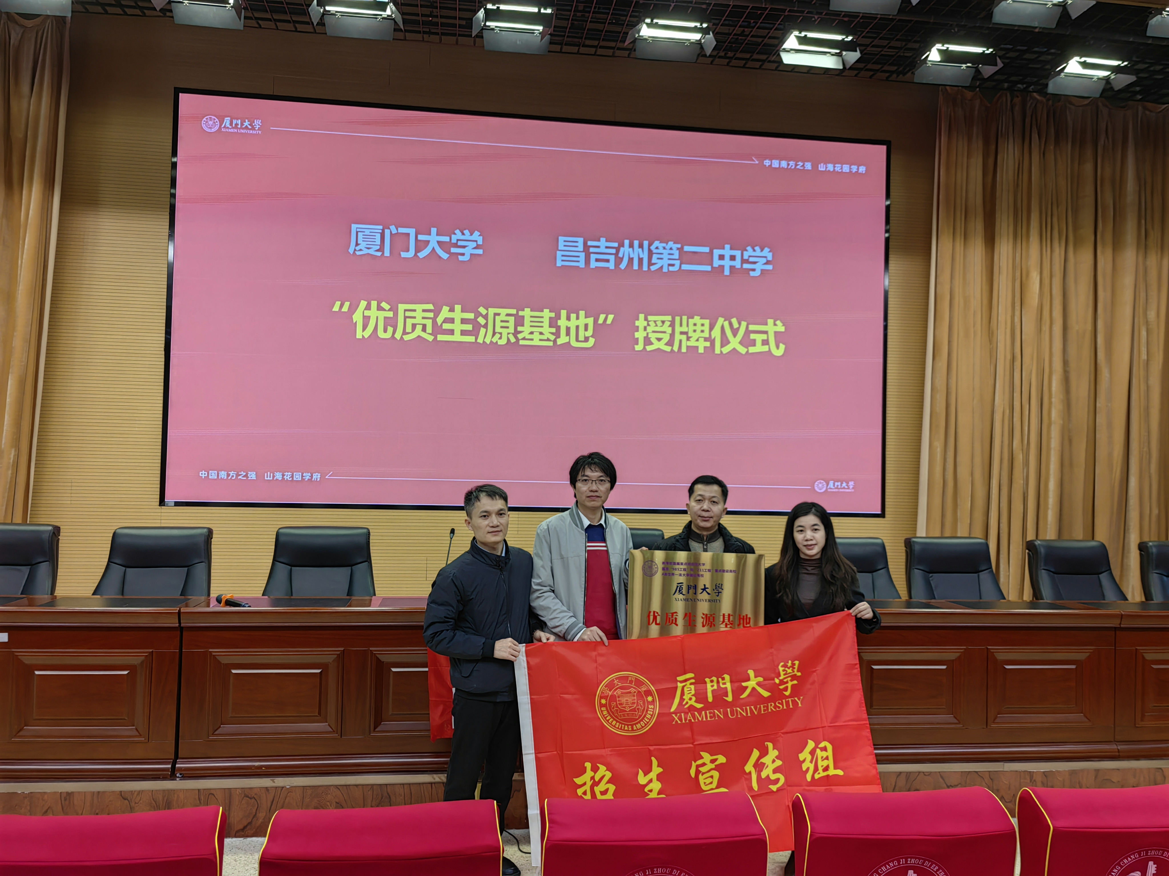 12月24日,厦门大学新疆招生宣传组副组长、能源学院党委副书记赖炜芳,能源学院杨述良教授一行赴新疆昌吉州第二中学开展招生宣传,并为昌吉州第二中学“优质生源基地”授牌。