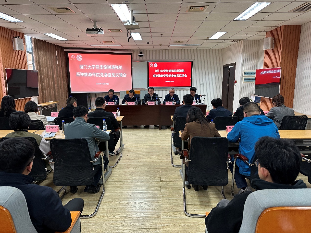 根据十二届校党委第三轮巡视工作部署,12月31日下午,校党委第四巡视组巡视能源学院党委意见反馈会在和木楼A221会议室召开。校党委副书记、纪委书记、国家监委驻厦门大学监察专员黄身勇,校党委第四巡视组组长侯利标、副组长李峰,巡视组其他成员,校党委组织部、校纪检监察机构等部门代表出席反馈会。学院党委书记王洁松、学院副院长(主持工作)郑志锋、学院党政领导班子其他成员、在职教职工参加了会议。会议由王洁松主持。