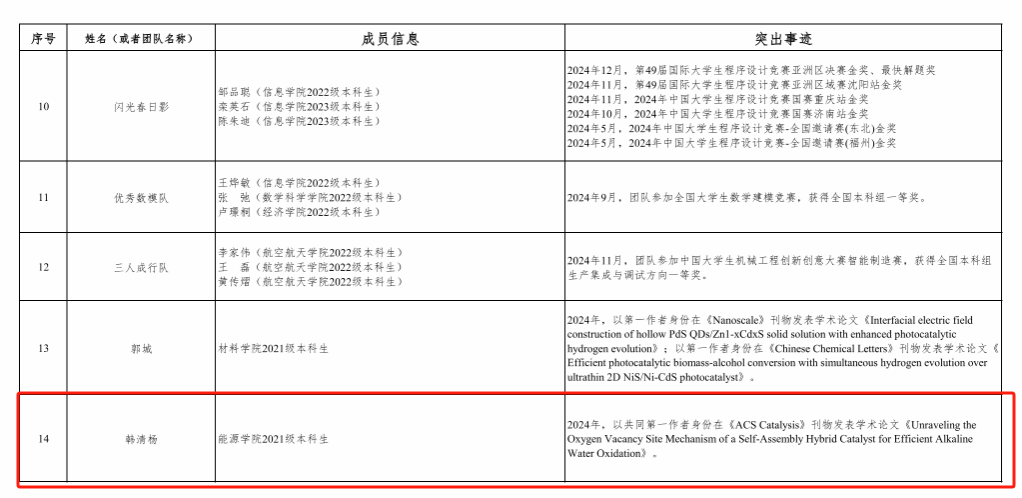 能源学院2021级本科生韩清杨受到学校通报表扬。2024年,韩清杨以共同第一作者身份在《ACS Catalysis》刊物发表学术论文《Unraveling theOxygen Vacancy Site Mechanism of a Self-Assembly Hybrid Catalyst for Efficient AlkalineWater Oxidation》。