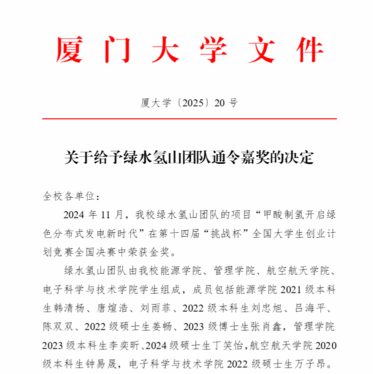 为表彰绿水氢山团队在创新竞赛领域所取得的突出成绩,根据《厦门大学学生表彰奖励暂行规定》,经校学生表彰奖励评审委员会评审,报校长办公会议、党委常委会会议研究,决定给予绿水氢山团队通令嘉奖。希望全校学生以他们为榜样,发扬优良学风,积极投身科学研究,努力提高综合素质,为推动科学发展和社会进步作出贡献。