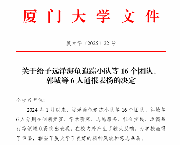 2024年1月以来,厦门大学学生分别在创新竞赛、学术研究、社会实践、志愿服务、道德品行等领域取得优异成绩,在校内外产生了较大反响,为学校赢得了荣誉,彰显了厦大学子良好的精神风貌和意志品质。根据《厦门大学学生表彰奖励暂行规定》,经各单位推荐,校学生表彰奖励评审委员会评审,决定给予16个学生团队、6个人通报表扬,颁发通报表扬证书。