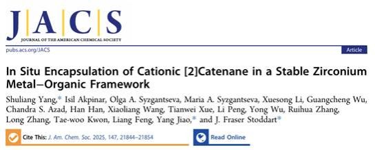 近日,我院杨述良教授与北京大学焦阳研究员以及美国西北大学J. Fraser Stoddart团队报道了一种绿色原位封装策略,成功地在室温、以水为绿色溶剂的条件下,将阳离子型索烃分子(DA[2]C)原位封装于UiO-66-F4 MOF中。该框架由Zr6节点和四氟对苯二甲酸配体构成。FTIR、ssNMR、XPS等证明了DA[2]C•4Cl分子的存在。理论计算表明,四氟对苯二甲酸配体与阳离子DA[2]C之间存在强相互作用,这主要源于羧酸根阴离子与DA[2]C阳离子之间的静电作用,以及配体中电负性强的氟原子对阳离子产生的吸引作用。作为概念验证应用,DA[2]C·4Cl/UiO-66-F4复合材料在催化脱毒反应中展现出优异性能:可将2-氯乙基乙基硫醚完全转化为相应的亚砜产物且选择性极高(>97%)。该方法还可扩展至其他有机阳离子分子,包括二苄基苯并咪唑氯化物和功能化的并苯基环芳烃,提供了一个构建具有多种应用潜力的主客体MOF体系的通用平台。相关成果以“In Situ Encapsulation of Cationic [2]Catenane in a Stable Zirconium Metal-Organic Framework” 为题发表在化学类顶级期刊《Journal of the American Chemical Society》上。