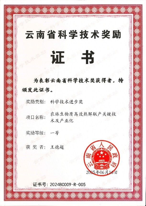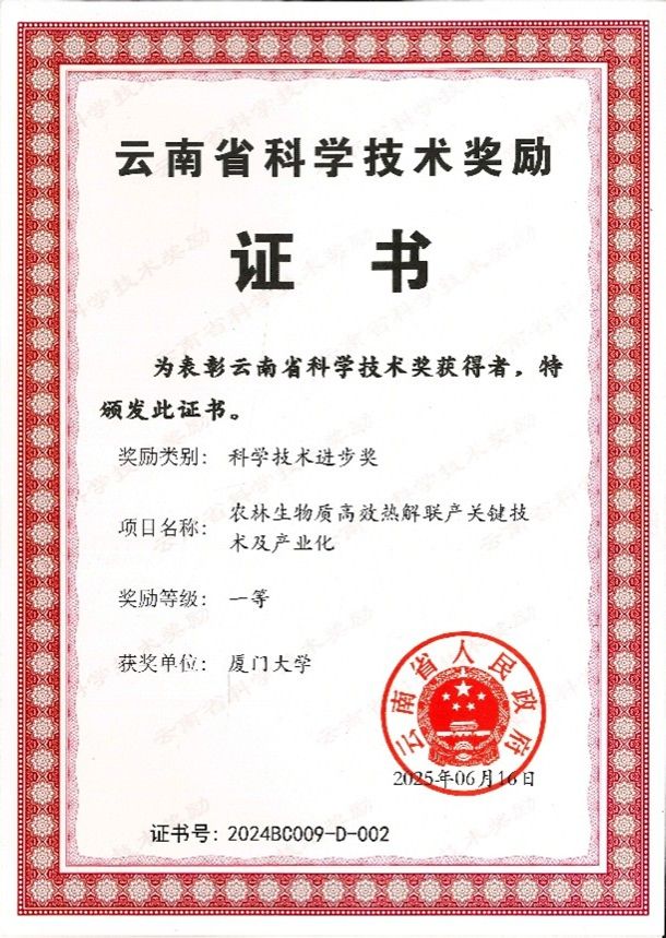 近日,2024年度云南省科学技术奖励大会在昆明隆重召开。我院郑志锋教授团队牵头完成的“农林生物质高效热解联产关键技术及产业化”项目荣获云南省科学技术进步奖一等奖。其中,厦门大学为第二完成单位,郑志锋教授为项目第一完成人,王德超助理教授为第五完成人。此次获奖不仅是厦门大学在生物质能源领域的又一重大成果,更充分彰显了我院在新能源技术创新、成果转化与产业化应用中的硬核实力。
