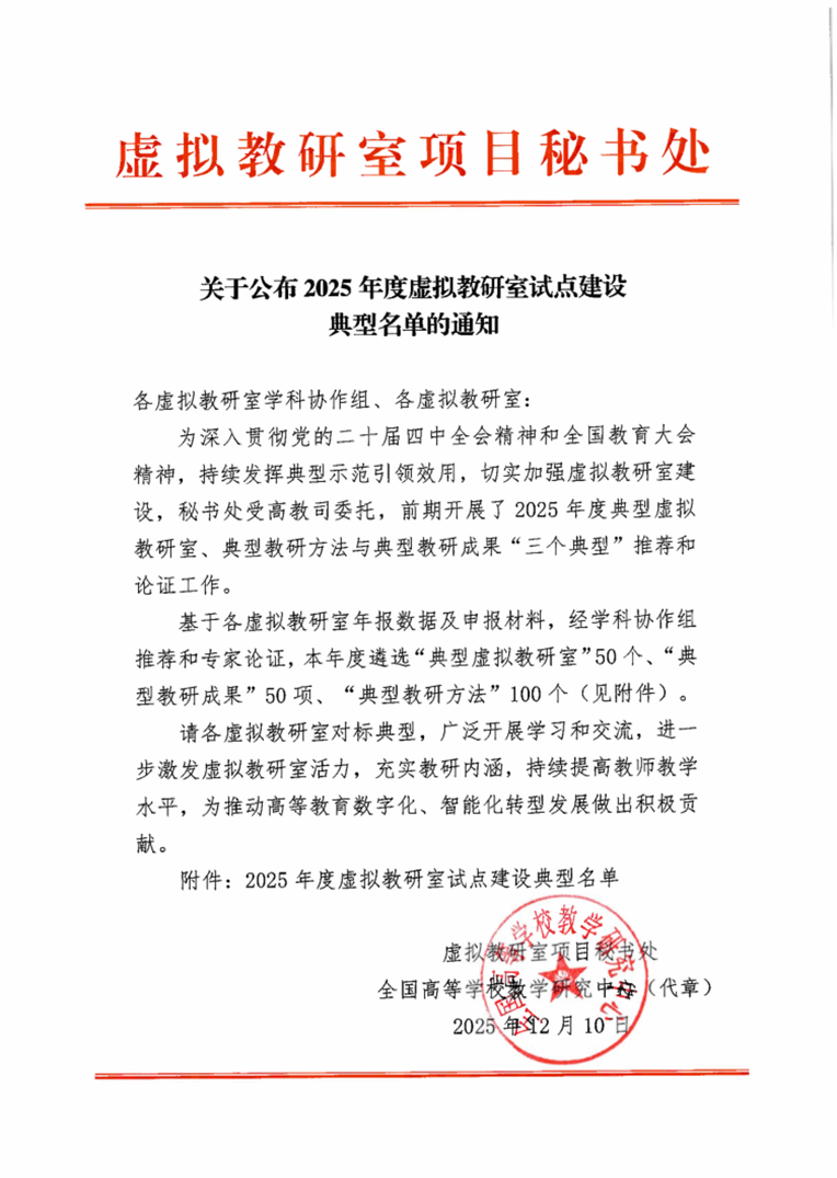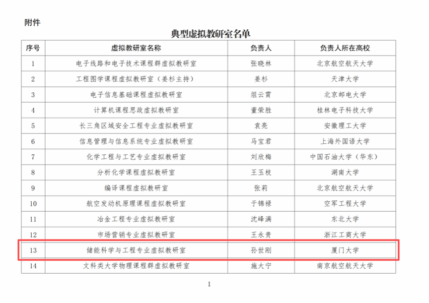 近日,教育部虚拟教研室项目秘书处公布2025年度虚拟教研室试点建设典型名单,包括典型虚拟教研室50个、典型教研成果50项、典型教研方法100项。我院储能科学与工程专业虚拟教研室入选2025年度典型虚拟教研室。至此,虚拟教研室已获评教育部虚拟教研室试点建设典型虚拟教研室、典型教研方法与典型教研成果“三个典型”全项荣誉。