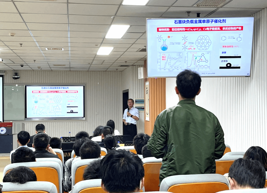 在交流环节,宋卫国研究员就单原子催化剂以及石墨炔材料的实际应用等问题,与在场师生展开深入交流。此次讲座不仅让师生深入了解石墨炔单原子催化的前沿研究成果,也促进了学科学术思想的碰撞与融合,为我院相关领域的科研创新与交叉合作提供了宝贵的启示。