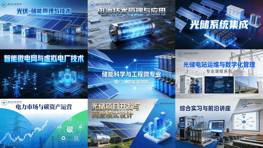 聚焦储能领域技术与行业需求,设置8门核心课程(总计15学分),涵盖光伏-储能原理与技术、电池技术、光储系统集成与智能设计、智能微电网与虚拟电厂技术、光储电站运维与数字化管理、电力市场与碳资产运营、光储项目开发与商业模式设计、综合实习与前沿讲座等关键领域,兼顾理论深度与实践实用性。