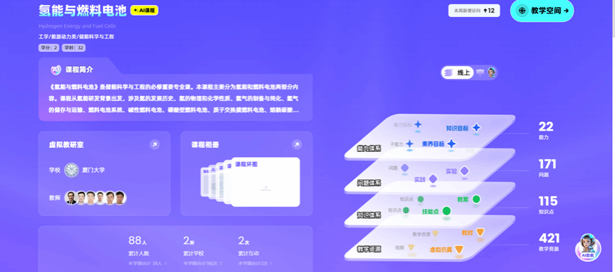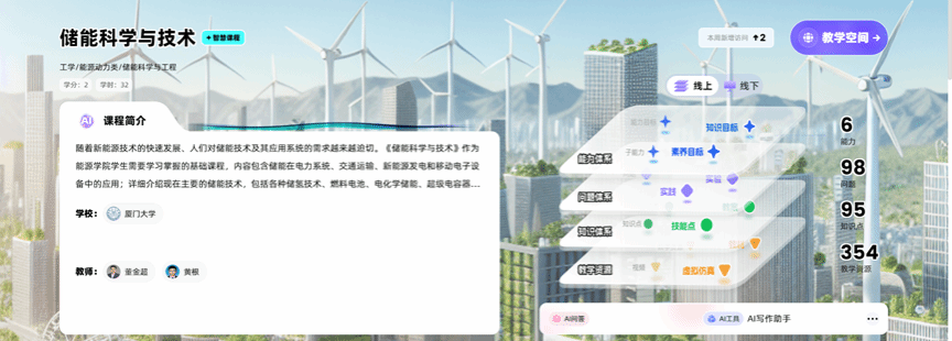 为微专业学生提供能源学科智慧课程作为额外知识扩展渠道。课程依托知识图谱与人工智能技术,搭建结构化、可视化的知识框架及智能化互动系统。学生可通过 AI 助教实时追踪学习进度,精准定位知识薄弱点,获取针对性强化训练方案,在微专业核心课程之外实现深度拓展,高效提升专业素养。