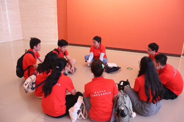 在参观完纪念馆后,实践队成员们在出口大厅的角落席地而坐,由学院党委副书记罗俊峰为队员们带来了一场现场微党课,结合着刚刚所参观的内容,罗书记带着同学们重温了百年党史中国共产党在延安这13年的历史,并着重介绍了在延安时期形成延安精神。