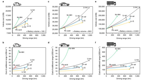 迷你车(低成本电动车市场的主流),中型车(远程电动车市场的主流)和半拖挂车(高频用车市场的代表)的计算结果如图5a&b、5c&d、5e&f 中。图5a、5c 与 5e 给出的是电动车成本与行驶里程的函数关系,曲线的终点意味着电池的体积已经触碰到车型容许的空间极限。考虑到空间的限制,铅酸与镍氢电池较低的能量密度明显是一大劣势。在长途电动车的性价比上,锂硫、锂空与锌空具备超过锂离子电池的潜质。电动车提升里程的成本,可以与客户购买扩充里程的意愿相对应,这个指标与电动车续航里程的函数关系如图5b、5d 与 5f 所示。图5b 表明,锂硫、锂空与锌空电池可以使迷你电动汽车的扩充里程成本大幅接近于发展中国家的平均购买意愿水平(注:图3)。