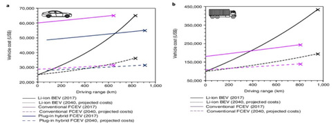 然而,在乘用车领域(图7a),燃料电池系统现阶段居高不下的成本让传统的 FCEVs 比 BEVs 贵上许多。先前的估算预计乘用型 FCEVs 与 BEVs 在较低续航里程的状况下有一个成本交叉,但随着近年来锂离子电池成本的直线下降以及之后估价的持续走低,这个成本的交叉点也被升级到较高续航里程的位置上(图7a)。另一方面,半挂卡车在工况的续航里程下貌似更适合于使用燃料电池系统而非锂离子电池进行电动(图6b),缘由十分明晰:对锂离子电池而言,要获得与燃料电池相同的续航里程,需要加增电池系统重量,那么电驱半挂卡车的载能势必减少。