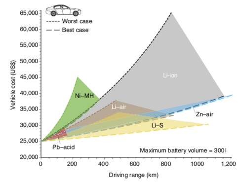 而且,在考虑进用以防御大气中二氧化碳以及水分的装置之后,锂-空气电池系统能量密度的最大预估值也只有 384 Wh/L(系统层级)。这实际上为锂-空气电池(相比于锂离子电池)大幅改良续航里程的能力上预设了一个体积能量密度的天花板(图6)。从另一个方面来看,它们较低的综合成本与较高的质量能量密度对于长途与低成本乘用电车而言还是很有吸引力的(图5)。然而不像锂-硫电池,锂-空气电池需要一种额外的高功率电池才能实际应用,因为它们的功率密度实在是太差了。