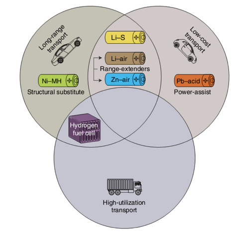 具备优异的质量能量密度、体积能量密度、成本、安全性能以及电网兼容性的二次电池与燃料电池,对于长途、低成本与高频用运输交通市场的电动化而言是十分必要的。尽管现在还没有一招鲜吃遍天的技术,但本篇综述所论及的每一种技术都至少可以对应到电动汽车这个新兴市场里的每一类终端应用(图8)。高功率型的铅-酸(铅-碳)电池可以作为低成本电车内低功率、高比能(质量能量密度)电池的增补,而镍-氢电池可以通过输出额外的能量并通过即时的更换结构或吸能组件来提升锂电式电车的续航里程。锂-硫电池可以完全替代锂离子电池助力长途、低成本电车市场,而锌-空气与锂-空气电池作为里程增益同样可以在上述领域内成功应用。