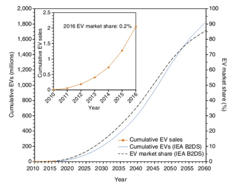 图1. 依照国际能源署“2 度以上”规划设计的电动汽车累计销量与市场份额的演化路线。插图为至 2016 年的电车累计销量,纯电动汽车、插电式混合电动汽车与氢燃料电池电动汽车的数据都被计算在内。