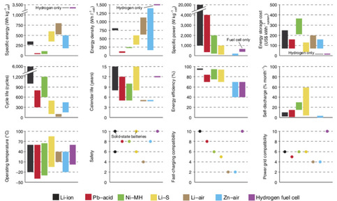 图4. 可充电电池与氢燃料电池的特征。质量能量密度、体积能量密度与功率密度波动范围的上界表示实际可达的预估数值,而下界则代表了已经获得的数据(储能成本如出一辙)。循环寿命、日历寿命、能量效率、自放电性能与工作温度范围的数据总结自商用或模型电池实测的上限与下限。储能成本指的是电池包或者系统层级的成本,而质量能量密度、体积能量密度与功率密度对应的是电芯层级的数据。现有文献的信息不足以确定质量能量密度、体积能量密度与自放电速率的上下限或者相关数值。对氢燃料电池,能量相关的特征只能应用在常规储氢罐内(不包括燃料电池)的氢上,功率密度也只能应用在燃料电池上(不包括储氢)。氢燃料电池的循环寿命与自放电速率尚不可用,因此也不讨论。安全性能、快充兼容性与电网兼容性均可以用 0 (最差)到 10 (最好)的数字进行量化评级。由于将可燃、液态的电解液更换为不可燃、固态的电解液,固态锂离子电池的安全性基本上倚靠隔离膜的安全评级。