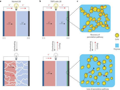 Prof. Zhenan Bao和Yi Cui强强联合[4],报道了一种可有效防止锂电池过热起火的新技术,他们想在情况不可收拾之前关闭电池,通过在锂电池中增加一个热敏高分子聚合物薄膜“开关”材料,当电池温度过高就会迅速切断电池内电路,使之降温;当温度降至正常,该聚合物薄膜又能恢复正常状态,让电池重新工作(图2)。他们将具有石墨烯涂层的镍钠米粒子嵌入聚乙烯材料中,制备出一种轻薄又具有柔性的导电塑料薄,用这种聚合物膜组装成的锂电池,在正常的工作温度下,电流很容易通过薄膜,电池可以正常充电和放电,但是当电池的温度升高到70℃时,聚乙烯开始膨胀,推动镍纳米粒子彼此分开,这样隔膜的导电性在短短的1s之内就会降低1000亿倍,电池中的电荷移动停止,从而使电池的温度下降。而且,当温度低于这种聚合物70℃时,该聚合物可以很容易的恢复到原来的构型,导电性也恢复正常,恢复电池功能。