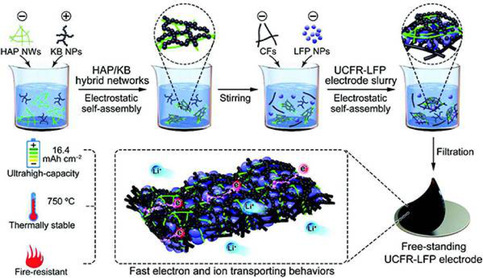 Prof. Yingjie Zhu和Xianluo Hu合作[3],采用羟基磷灰石超长纳米线、科琴黑纳米颗粒,碳纤维和磷酸铁锂粉末作为原料,通过简单的静电辅助自组装的方法成功的制备了一种既可以耐高温、又具有活性物质高负载量的新型磷酸铁锂复合电极(UCFR-LFP),可以作为锂电池正极(图1)。在自组装和抽滤的过程中,磷酸铁锂纳米颗粒均匀得分散在高导电性且多孔的羟基磷灰石超长纳米线/科琴黑纳米颗粒/碳纤维基底中,从而形成自支撑、具有独特复合多孔结构的磷酸铁锂耐高温正极材料,其具有优异的热稳定性和耐火性,即使在1000℃的高温下也能保持其电化学活性和结构完整性。