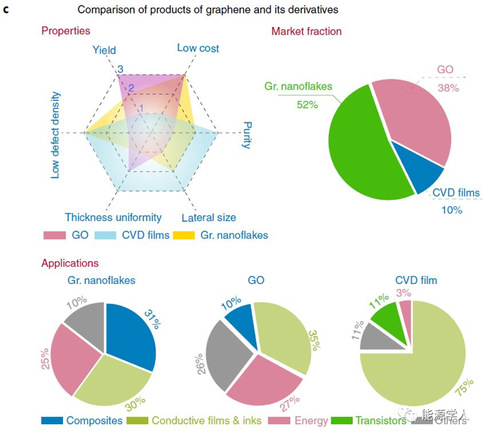 图1 a,不同类型石墨烯产品示意图; b,产品的不同性能示意图; c,不同产品的性能和市场应用分布