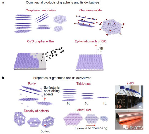 如图2a~c所示,过去十年来石墨烯的产量迅速增长,尤其是CVD技术生产的石墨烯所占的比例越来越大。中国已经是世界上最大的供应国,美国排第二,产量在稳定增长,欧洲石墨烯产量排第三。过于激进的生产也有一些问题,包括普遍存在的质量和性能一致性低,离真正的工业化生产还任重道远。以中国的生产为例,每年生产2000吨石墨烯粉末和350万平方米的石墨烯薄膜,这对于规模化生产是足够的。但是石墨烯产品的质量却差异很大,取决于石墨烯来源,生产技术和生产条件的监控。如图2d所示,产品在尺寸、层数以及缺陷密度和纯度方面都有明显的不一致性,这导致了一些对石墨烯粉末性能的夸张放大和不能重复的报道。在CVD技术制造的石墨烯中,也存在不同公司产品导电性不同的问题,以及不同批次的产品的性能差异的问题。因此,石墨烯产业需要统一的技术标准和明确的产品分级标准。