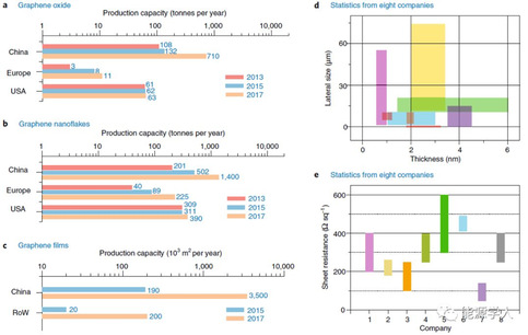 图2 a,b,c分别为不同国家和地区的氧化石墨烯、石墨烯片和石墨烯薄膜的年产量,RoW表示中国外的所有国家的产量总和。d为8个公司的石墨烯片的横向尺寸、厚度的分布范围,8个公司来自美国、中国、加拿大、日本和西班牙;e为8个公司生产的石墨烯薄膜的阻抗