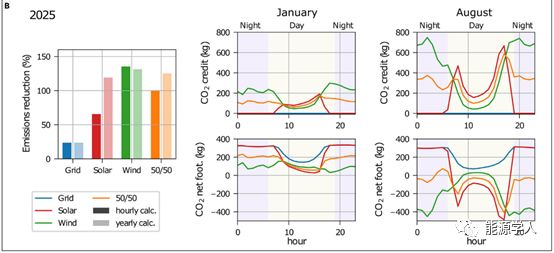 作为高太阳能发电系统中碳核算的一个代表,作者以加利福尼亚独立系统运营商(CAISO)服务区域的1兆瓦恒定负荷为例,其电网组合如表1所示。作者定量评估了三种脱碳策略:消费者购买足够的可再生能源,以满足(1)仅太阳能,(2)仅风能,或(3)半风能和半太阳能。为了实现100%的可再生能源供应,1兆瓦的恒载用户需要购买3.16兆瓦的风能或3.60兆瓦的太阳能发电能力,消费者的净环境影响为购买电网电力释放的碳与购买可再生能源碳之间的差额。