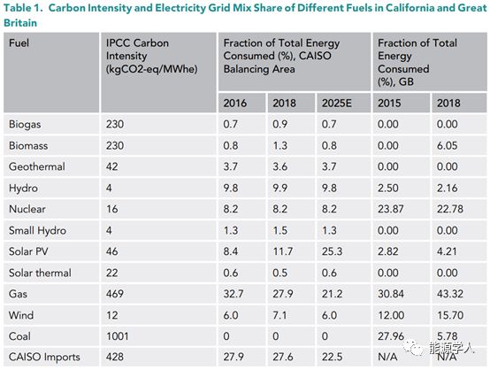 不同的碳核算指标,可以使消费者选择何时何地消耗所需的能源。碳强度,或平均排放因子(AEFs),为给定地点和时间通过电网电力的环境质量,可作为排放量与电能的比率,单位为kgCO2eq/MWhe。表1提供了排放强度的估算汇编,可以看到,燃煤发电产生的碳排放量是燃气的两倍,而燃气本身的排放量是目前太阳能发电技术的十倍。